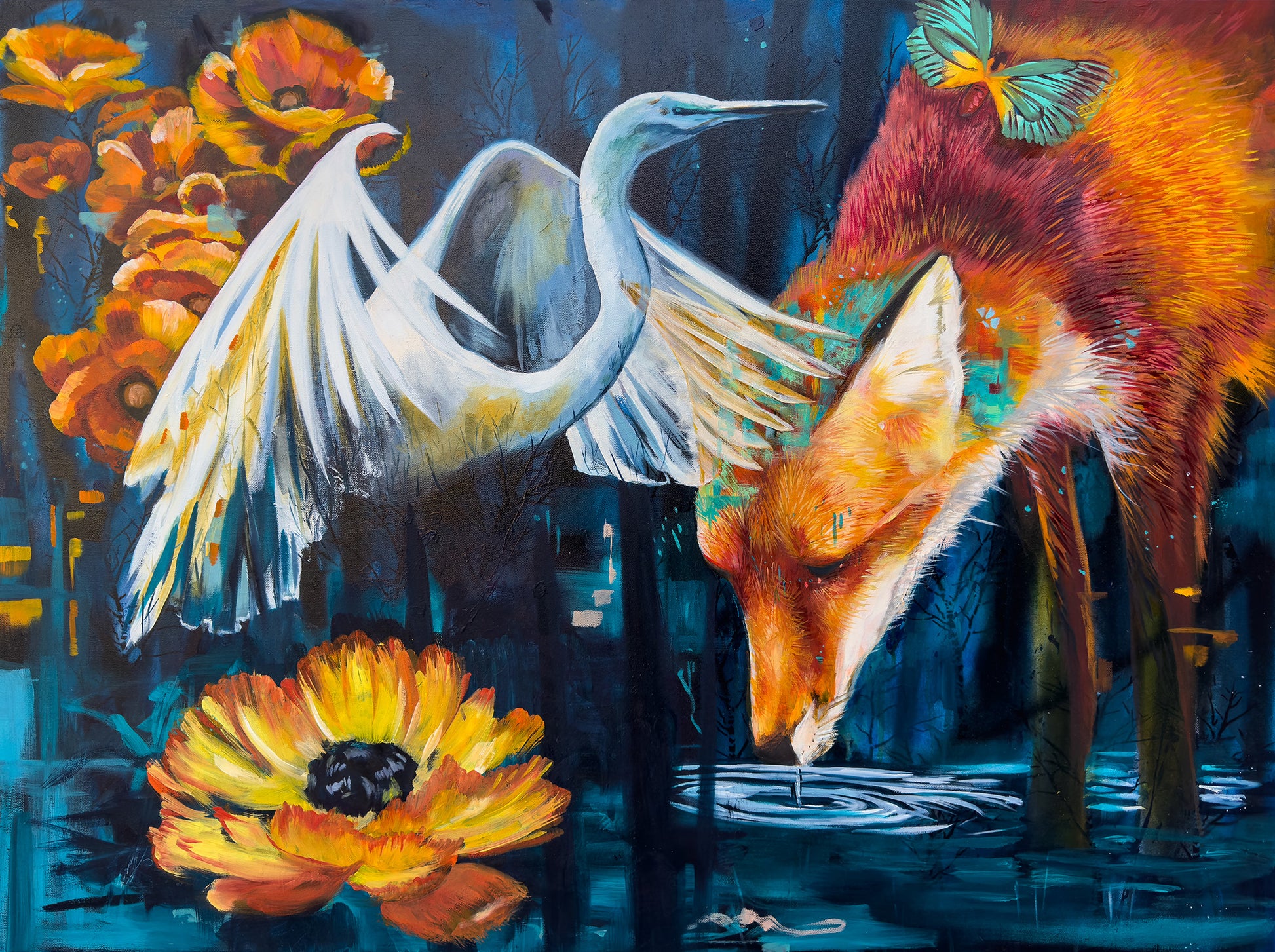 Inspiration: I love egrets. There are many of them where I live. For this piece, I was in the mood for a fairy tale. I wanted to feel a connection between two souls.